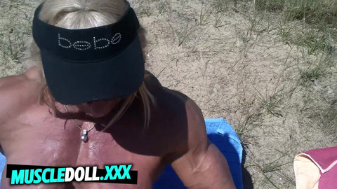 Professional bodybuilder flex her huge muscles outdoor
