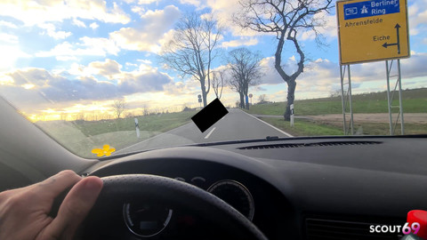 German blonde Hitchhiker Pick Up and get risky POV Outdoor Fuck in Car
