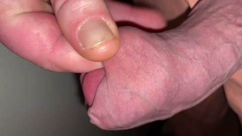 Rubbing his veiny foreskin over his swollen knob until his cum shoots out of his split