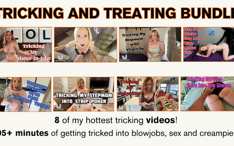 Ready to trick your favorite MILF this Halloween? I've bundled up 8 of my hottest tricking scenes just for you - over 95 minutes of me getting fooled into sloppy blowjobs, hard fucking, and hot creampies that leave me dripping! From stepmom strip poker gone wild to a sneaky Zentai suit trap, these taboo roleplays will have you stroking non-stop. Included in the bundle: