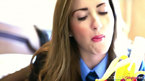 College girl Sophia Smith takes to lying on her bed in her full college uniform, teasing us with munching on a banana and giving us all a few suggestive looks, and playfully caressing her lips around the shaft of the banana, and looking sexy in her college uniform with her legs and high heels playing in the background of the shot now in 4KUHD.