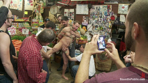 The bystanders jump on Jacob Durham for shoplifting. They empty out his pockets then get carried away. Christian Wilde rips off his clothes and spanks the boy’s ass. Jacob tries to fight back but it’s fruitless. He is made to suck cock and one dude blows a hot load all over his face. The crowd fucks him with vegetables and then fucks him with their cocks. A little WAM (wet and messy fetish) play takes place as they smear ripe bananas all over his face and body. The crowd goes wild when one dude dumps crushed watermelon over Jacobs head. The poor stud receives multiple cum loads on his face. One shopper clean off his face by pissing on it. We don’t think he will shoplift again.