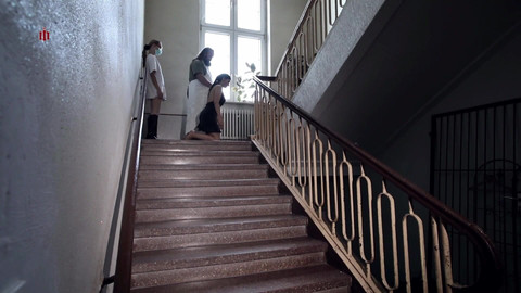 After a party, Andrea arrives way too late for her cleaning duty in the institute. Her foreman carries out her punishment personally. She has to clean the stairwell naked and with all her physical effort and in a very humiliating way. (Scene from movie "Belastungsproben / Ability Tests")