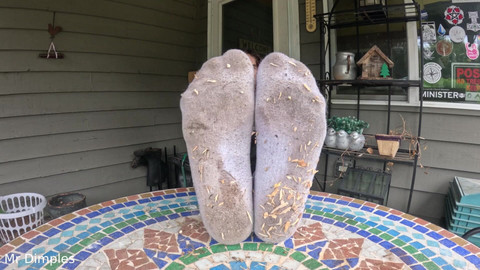 I head outside and show off my feet on porch. First I show off my dirty socks before I take them off and start sniffing them while wiggling toes. I was wearing boots earlier so they have a vinegar smell. Smelled really good!