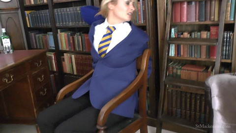 Kelli has been caught by the Chavs trying to sneak out of college dressed in the St Hugh’s all boys uniform; she was hoping to sneak in to meet her boyfriend. The Chavs couldn’t pass on such an opportunity and after catching her they pushed her into the chair in Headmistress’ office and bound her. Sophia has found her and finds it all very amusing. She agrees to untie her, but not before she has some fun. She plans to sneak into St Hugh’s herself later so she will take the uniform, she slowly slips of her own very sexy St Mackenzie’s uniform. But she isn’t in a hurry, watching Kelli squirm is great fun, she even stops to take selfies of them both! Eventually a completely naked Sophia releases Kelli, who is in just her lingerie, but she is not finished there, she wants her bra before she can leave and Kelli has no choice but to hand it over!